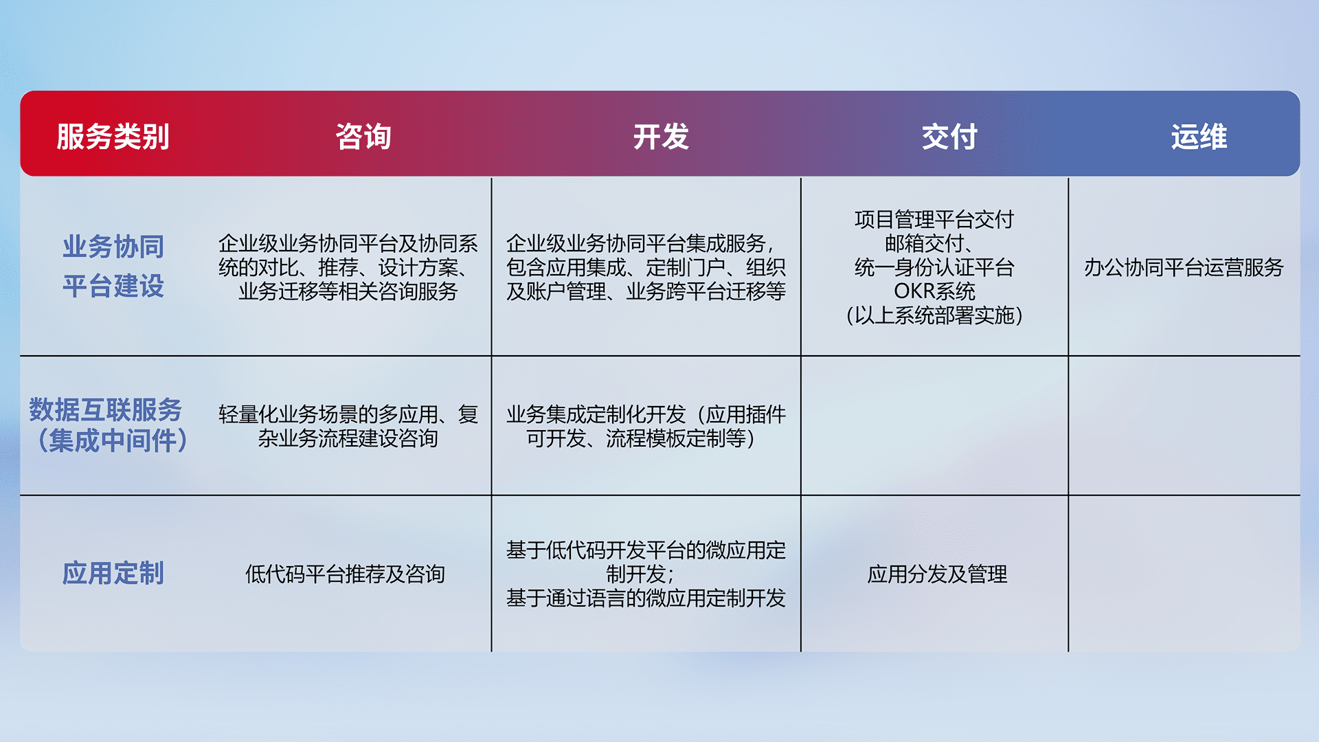 针对钉钉、、、企微、、、IDaas等平台级产品提供产品的规划、、方案、、交付、、、定制化开发等服务,,,,实现如统一协同办公、、、智能客户服务、、混合会议管理、、、智能数据查询、、、等业务场景,,,实现数字化转型。。。