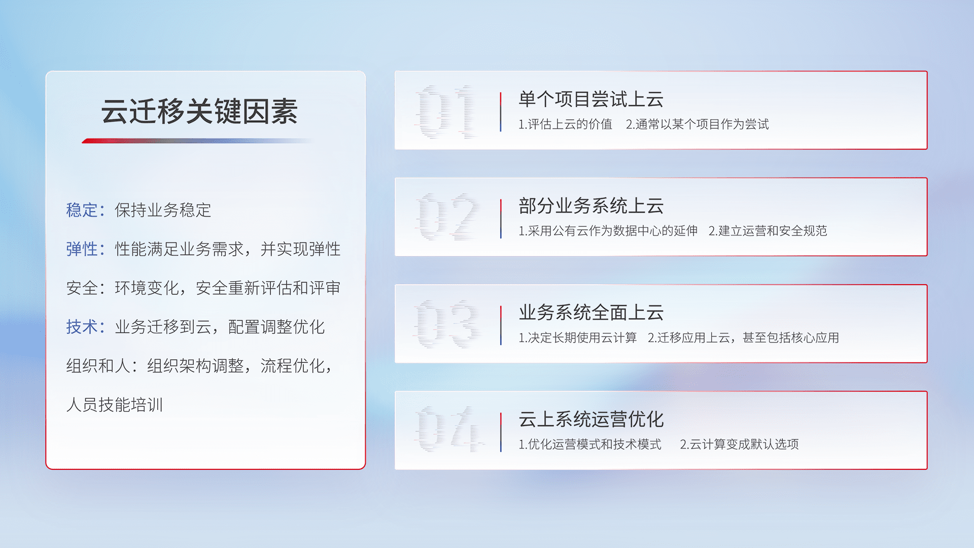 结合实际业务,,,从规划设计、、、云平台选型、、云原生改造、、、数据迁移、、、、集成交付,,,,迁移全过程为客户识别最佳上云路径,,做好风险识别管理,,设计网络架构、、、、身份权限、、安全审计合规、、、、操作审计、、日志审计、、、、监控告警策略、、多站点容灾设计等,,对云上基础设施进行整体规划,,,,提升IT治理水平,,以满足弹性、、、高可用、、、、高性能的需求。。。。