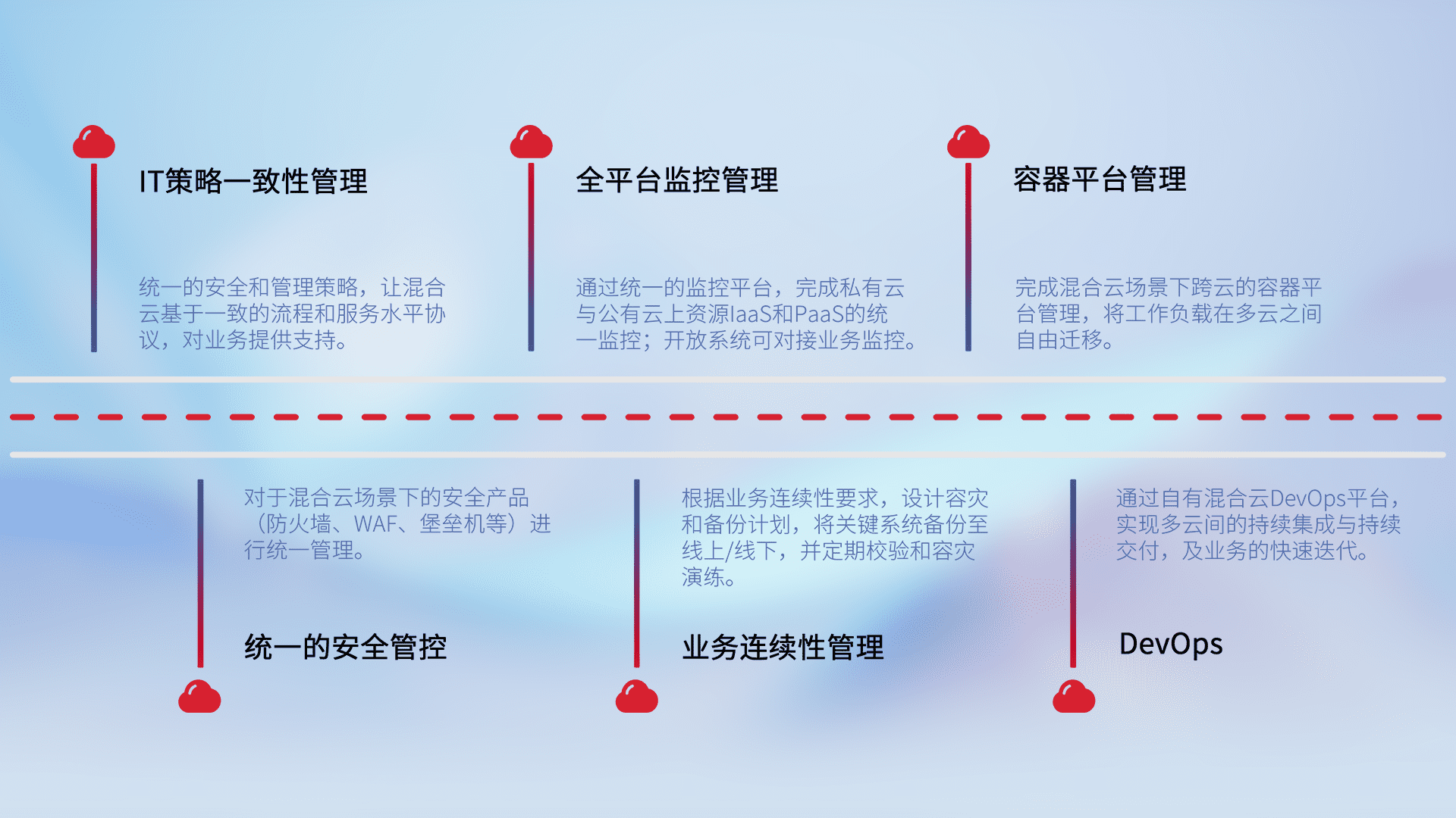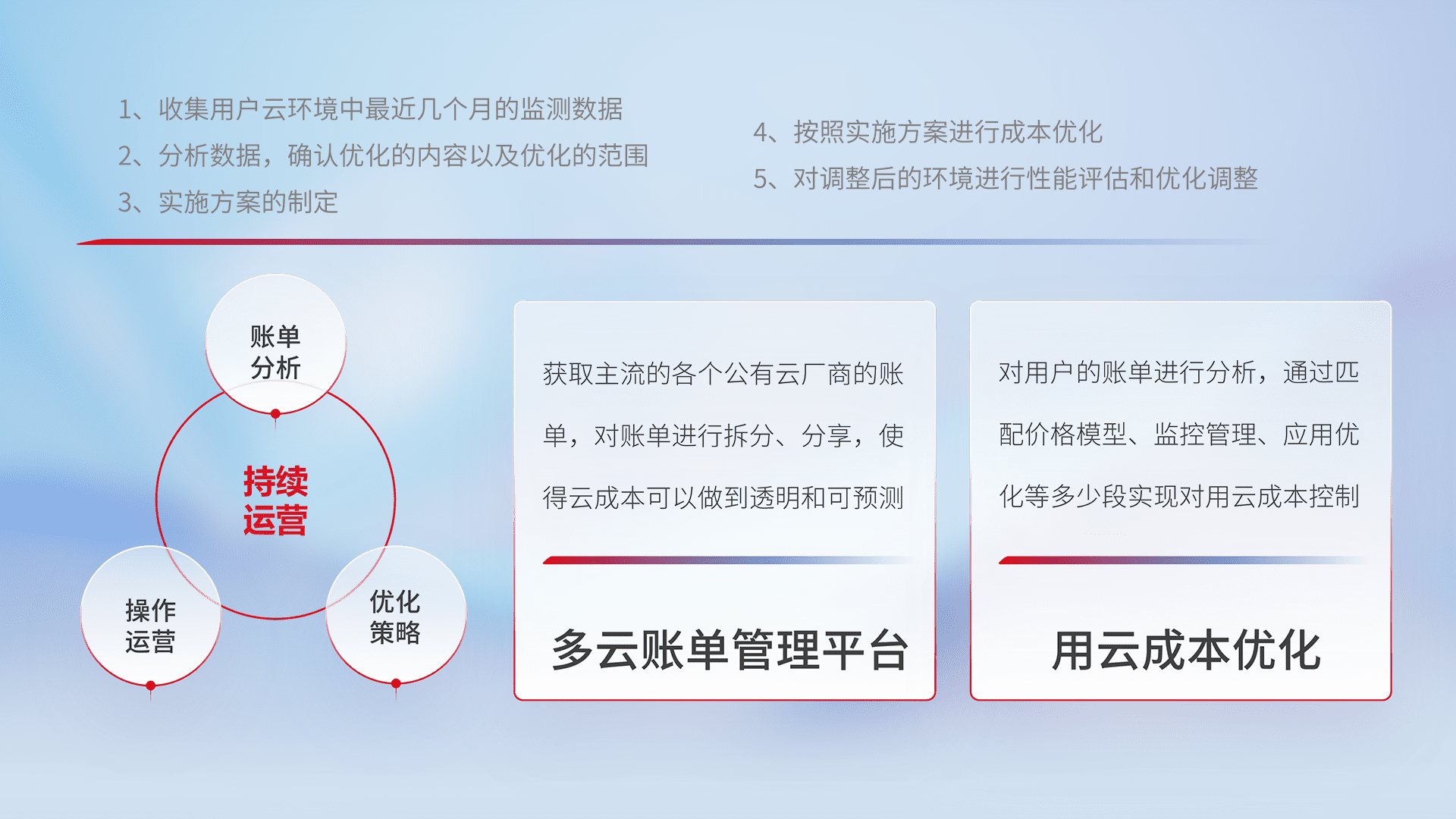 通过多云纳管,,,以统一的资源数据模型把客户的云资源进行抽象和封装,,进而实现对多云资源的统一操作,,,保障云资源管理的可靠性、、、稳定性与可用性。。。。量身定制化运维内容,,,,配置、、、、开发运维、、、补丁管理、、、备份、、监控、、、认证和访问管理、、、审计和日常巡检等,,,保障在用云过程中的可靠度,,稳定度以及高可用率。。。。